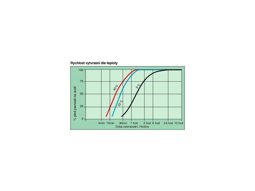 TYPICKÉ VLASTNOSTI NEVYTVRZENÉHO MATERIÁLU: - Měrná hmotnost při 25 °C 1,08 - Bod vzplanutí - viz Bezpečnostní list - Viskozita, Brookfield - RVT, 25 °C, mPa•s (cP): - Vřeteno 3, rychlost 20 ot/min. 1 300 až 3 000LMS Viskozita EN 12092 - MV, 25 °C, po 180 s, mPa•s (cP): - Smyková rychlost 129 s-1 350.
